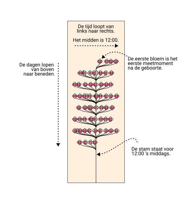 De plaats van de bloem is gebaseerd op de datum en tijd van het meetmoment: